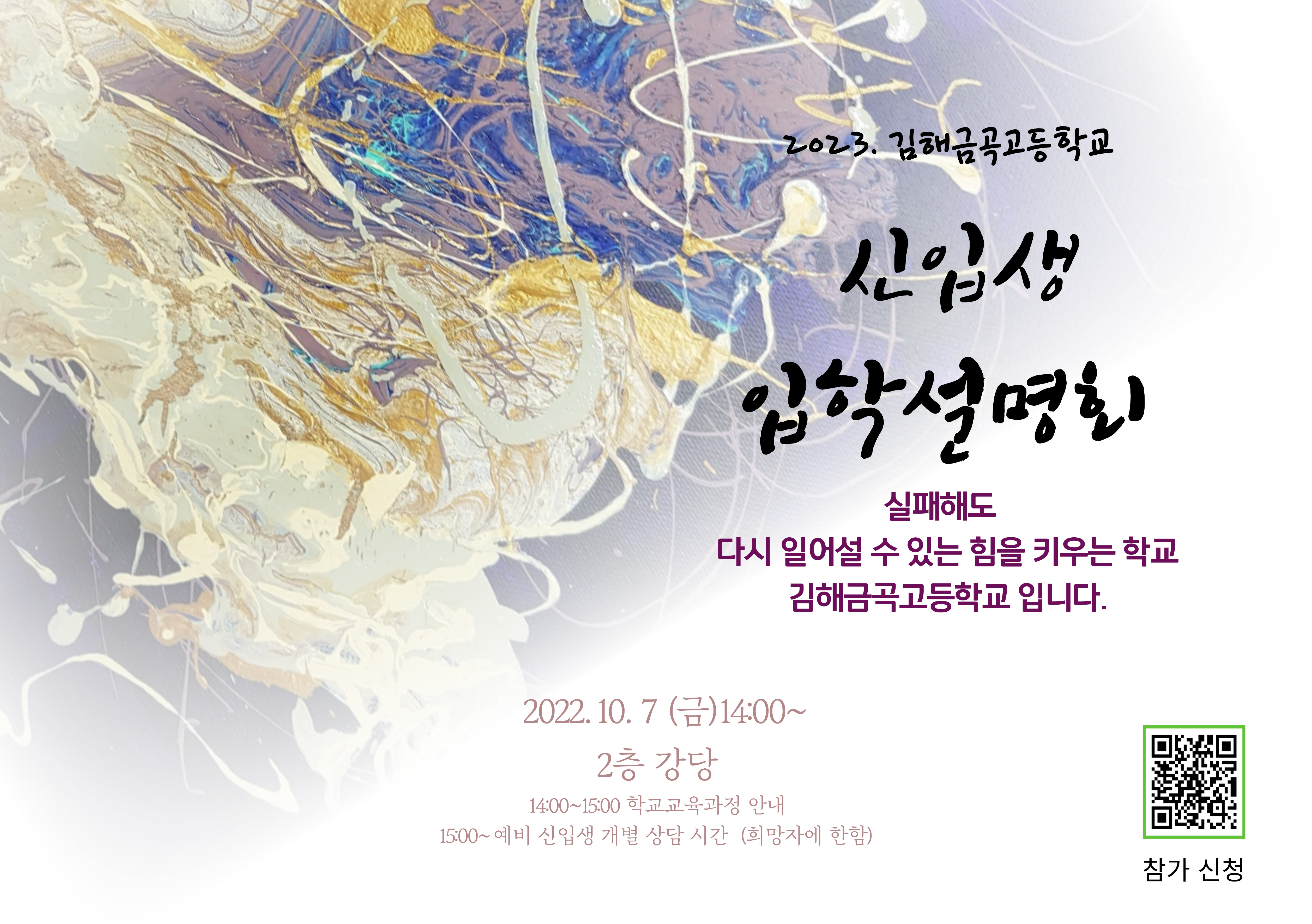 1. 김해금곡고등교는 2020학년도에 신설된 공립형 대안고등학교(각종학교) 입니다. 2. 경남 김해 한림에 위치해 있으며 입시위주의 교육이 아닌 다양한 교과를 위시로 대안교육을 실시하고 있습니다. 3. 월~금요일 전교생 기숙사 생활을 하고 있고, 적극적인 대안교육활동 교육과정을 운영하여 학생들의 다양한 적성과 꿈이 이루어질 수 있도록 노력하고 있습니다. 4. 2023학년도에는 경남, 부산, 울산 지역 학생들을 대상으로 신입생 15명을 모집하고 있습니다. 5. 이에 아래와 같이 2023학년도 신입생 입학설명회를 개최하고자 하오니 많은 관심과 참여 부탁드립니다. 단, 입학설명회 참가 신청서를 QR code 접속후 구글 설문지로 보내 주시는 분에 한해서 참가가 가능합니다. 6. 참가 인원은 선착순 50명 이내로 제한 합니다.(선착순) 7. 일시 : 2022.10.07.(금) 14:00~16:00 (13:30부터 학내 입장이 가능합니다.) 8. 장소 : 경남 김해 한림면 금곡로 182번길 43, 김해금곡고등학교 2층 강당 9. 참가 신청서 : 아래 QR코드로 신청