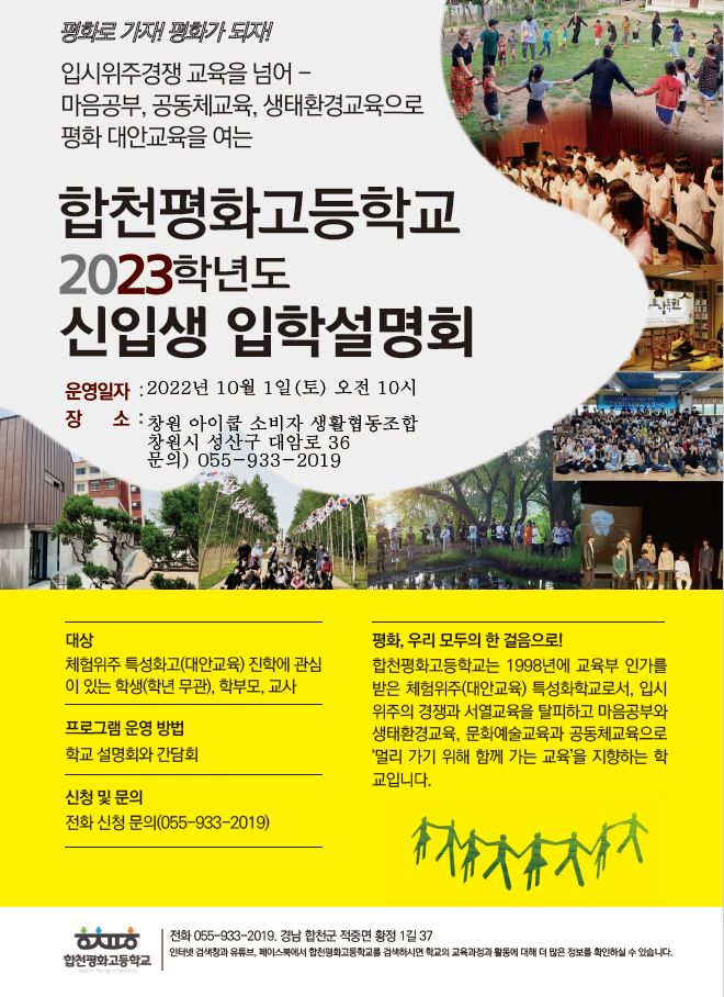 1998년 교육부 인가로 개교하여 마음공부, 평화공동체, 생태환경교육으로 우리나라 대안교육의 길을 열어온 체험위주 특성화 고등학교(정규 대안고등학교)인 합천평화고등학교에서 ‘대안교육이 미래교육이다’라는 주제로 학교설명회를 아래와 같이 개최합니다. 가. 프로그램 명 : 찾아가는 학교 교육과정 설명회(창원) 1) 때와 장소 순 | 일시 | 장소 | 1 | 2022년 10월 1일 (토) 오전 10시 | 창원 아이쿱 소비자 생활협동조합 창원시 성산구 대암로 36 | 2 | 2022년 10월 29일 (토) 오전 10시 | 마산 아이쿱 소비자 생활협동조합 경남 창원시 마산회원구 내서읍 삼풍로 139, 2층 |