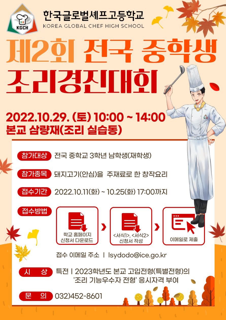 한국글로벌셰프고등학교에서는 창의적이고 도전적인 미래인재발굴을 위하여 [제2회 전국 중학생 조리경진대회] 를 아래와 같이 개최합니다. 가. 일 시 : 2022.10. 29.(토) 10시~14시 나. 참가 대상 : 전국 중학교 3학년 남학생 다. 대회 주제 : 돼지고기(안심)를 주재료로 한 창작요리 라. 접수 기간 : 2022.10. 11.(화) ~ 2022.10. 25.(화) 17:00까지 마. 접수 방법 1) 이메일(Isydodo@ice.go.kr)접수 2) 접수서류 : 한국글로벌셰프고등학교 홈페이지에서 다운로드 참가신청, 레시피 작성 접수(레시피 원본 대회 당일 1부 제출)