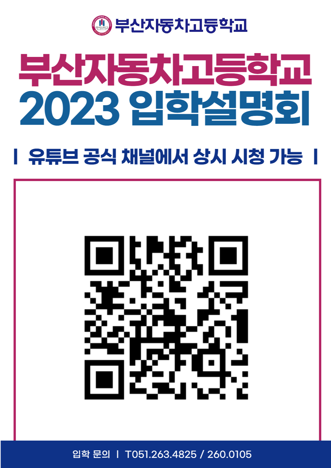 가. 운영방법: 부산자동차고등학교 유튜브 공식채널을 이용한 상시 시청 가능 나. 내용: 2023학년도 신입생 입학전형 관련 정보 제공 다. 온라인 시청방법 1)부산자동차고등학교 유튜브 공식채널이용 2)부산자동차고등학교 홈페이지 하이퍼링크를 통해 공식 유튜브 채널 접속 2. 추가사항: 유튜브 공식 채널에 게재된 2023학년도 부산자동차고등학교 입학설명회 영상에 접속 가능한 QR코드를 첨부합니다. 3. 문의전화: 051-260-0114, 051-260-0105
