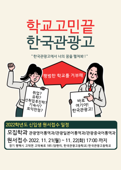 한국관광고등학교는 대한민국 최초로 설립된 관광특성화고등학교입니다. 전교생이 기숙사 생활을 하며 전문적인 외국어교육 및 실무교육으로 21세기 관광산업을 선도할 인재로 성장하고 있습니다. 아래와 같이<2023학년도 신입생 선발>일정을 안내드립니다. - 아 래 - 1. 지원자격 : 전국 중학교 졸업예정자 및 졸업자, 고등학교 입학 자격 검정고시 합격자, 중학교 졸업과 동등 이상의 학력이 있다고 교육부장관이 인정하는 자 2. 모집학과 : 관광영어통역과, 관광일본어통역과, 관광중국어통역과 3. 입학원서 및 서류 접수일 : 일반전형2022년 11월 21일(월)~11월 22(화)17:00까지 4. 2차 전형일(면접 및 학업계획서) : 일반전형 2022년 11월 24일(목) 09:00 5. 최종합격자 발표일 : 일반전형 2022년 11월 25일(금) 16:00 6. 기타 문의 : 한국관광고등학교 교무실 031)662-5113