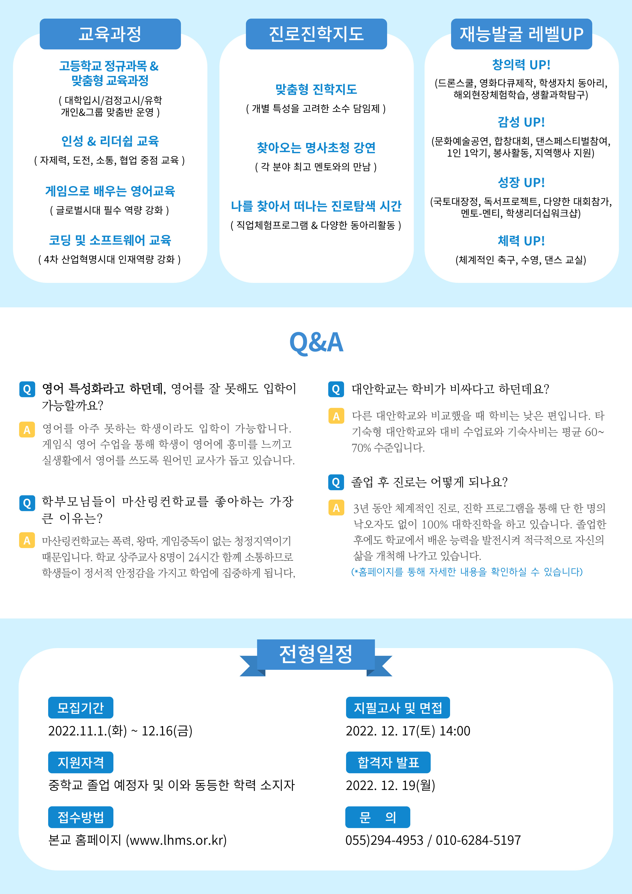 1. 마산링컨학교는 청소년들에게 도전, 교류, 연합을 모토로 밝고 건강한 마음의 세계를 형성시켜 차세대의 훌륭한 지도자를 양성하는 대안학교입니다. 영어특성화 교육과 일반교과교육, 해외현장 체험학습, 국토대장정, 수영, 태권도, 각 나라 문화공연, 명사 초청강연, 1인1악기연주 등 다양한 활동을 하고, 특히 능숙한 영어를 구사하여 글로벌 시대의 참신한 인재를 양성하는데 목표를 두고 있습니다. 2. 2023학년도 신입생 모집 자료를 첨부하니 관심있으신 분은 열람해보시기 바랍니다. (홈페이지 주소 : http://www.lhms.or.kr/)