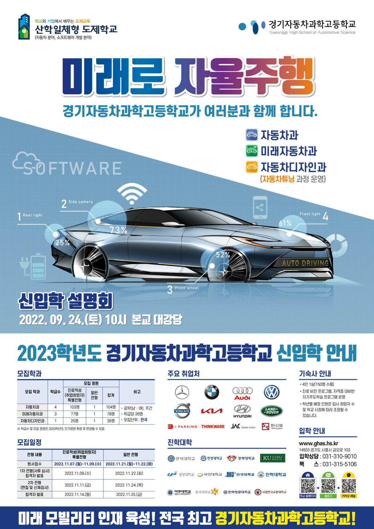 1. 경기자동차과학고등학교는 산학일체형 자동차 분야 도제거점학교/ 소프트웨어개발 분야 도제학교로서 아래와 같이 2023학년도 신입생을 모집합니다. 모집 지역 | 전국(남·여, 학급당 26명) | 모집 학과 | 학 과 | 학급수(인원) | 일반전형 | 진로적성 특별전형 (취업희망자) | 자동차과 | 4학급(104명) | 1명 | 모집완료 | 미래자동차과 | 3학급 (78명) | 1명 | 자동차디자인과 | 1학급 (26명) | 1명 | 합계 | 8학급(208명) | 3명 |